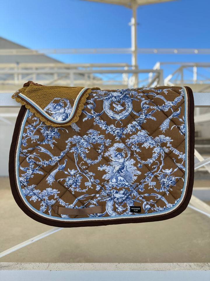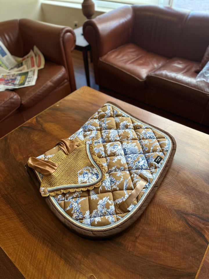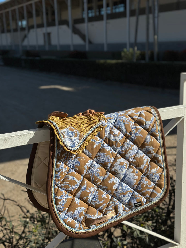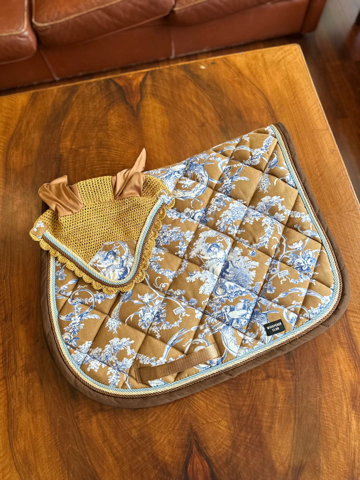 Warm caramel tones meet delicate porcelain-blue toile florals — a combination that feels like golden sunlight through an antique French window.