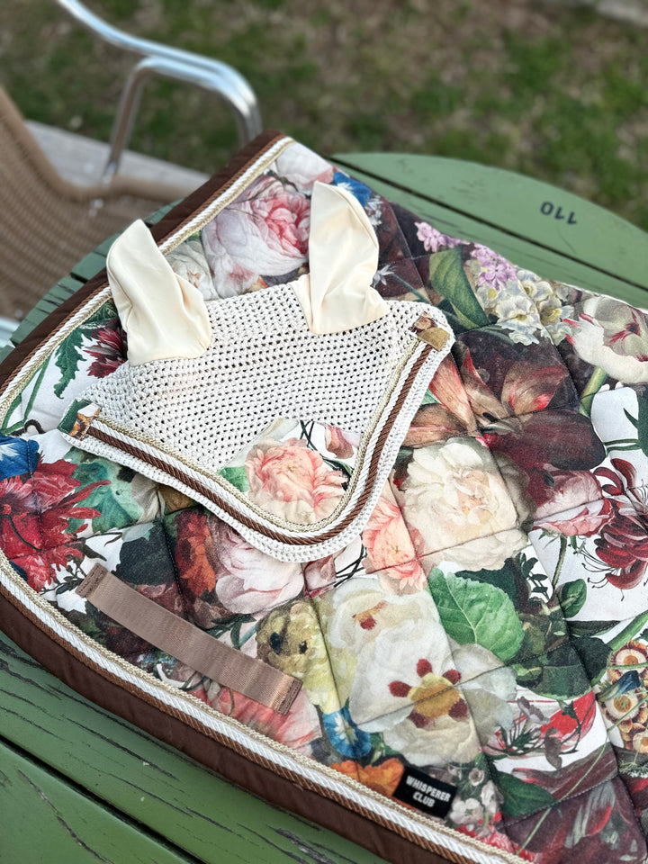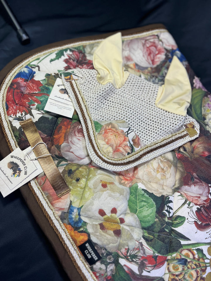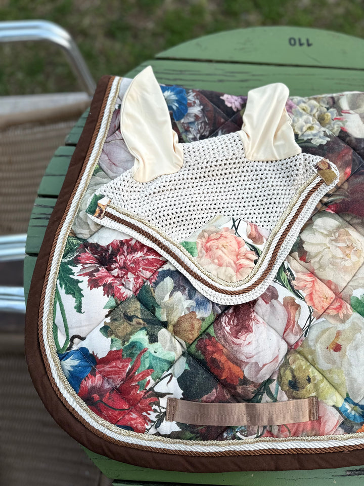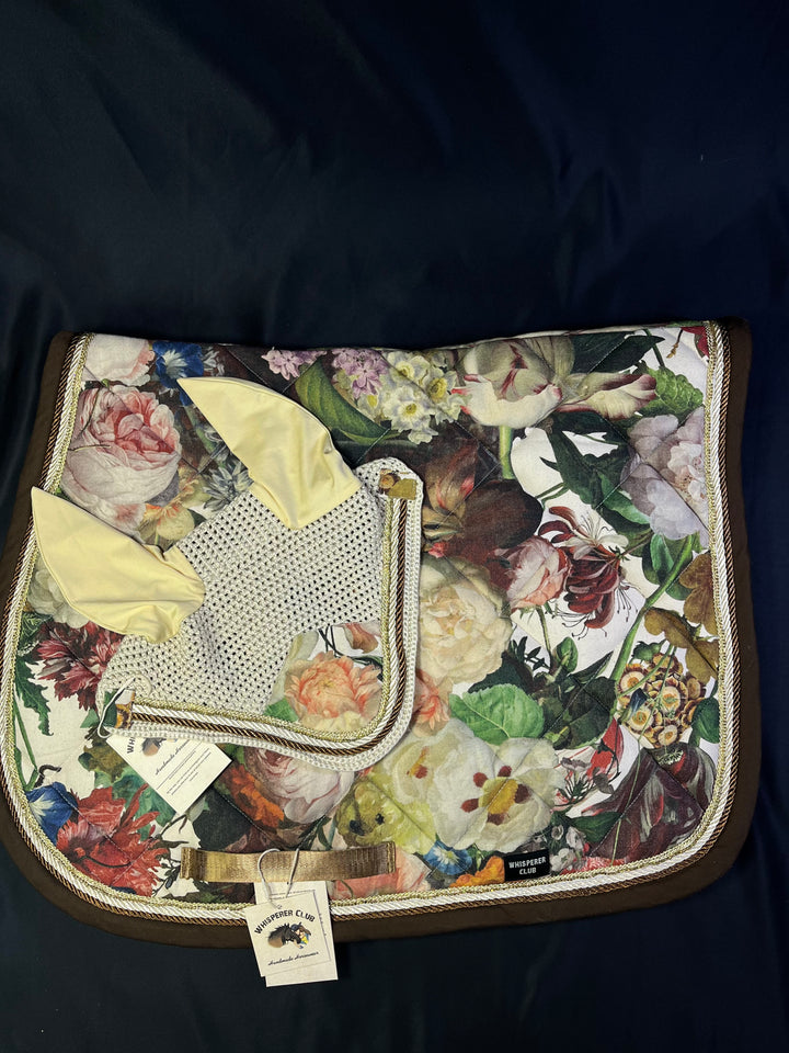 A luxurious handmade saddle pad and ear bonnet set inspired by the opulent floral still-life paintings of the Dutch Golden Age. “Jardín real” combines a rich botanical tapestry print with creamy yellow ears, golden braiding and chocolate-brown edging to create a striking, timeless look for the show ring.