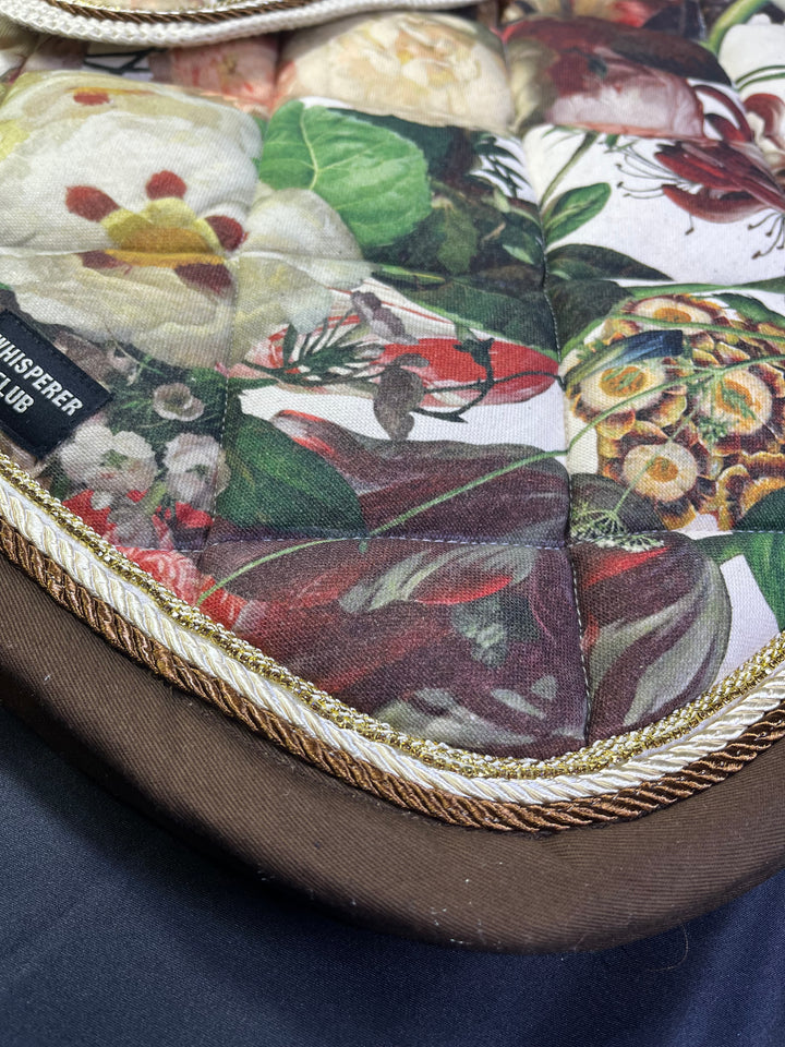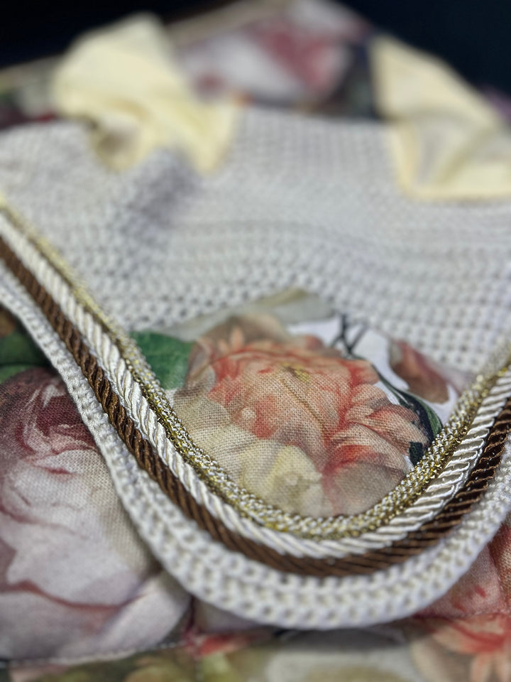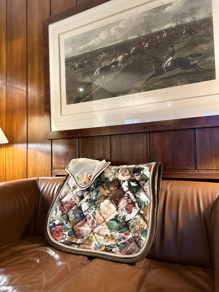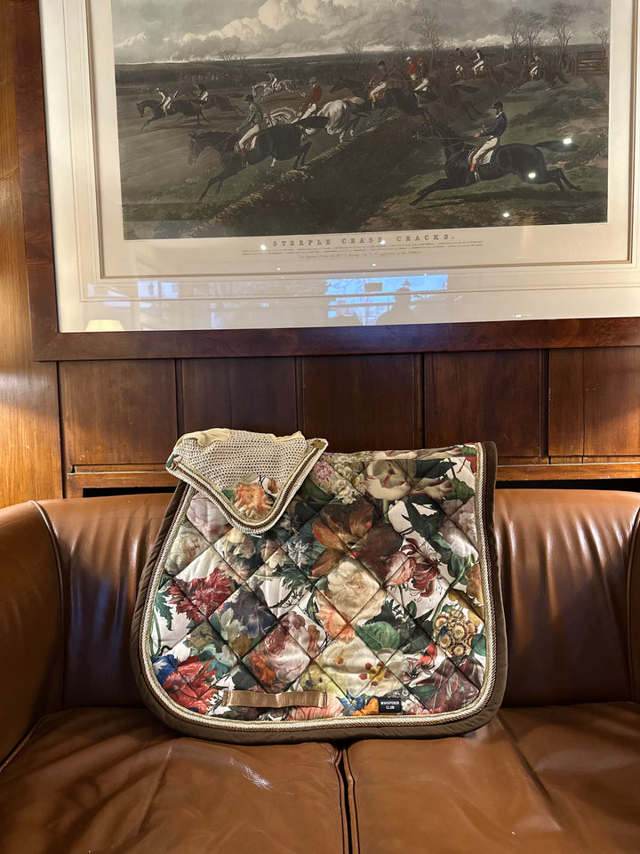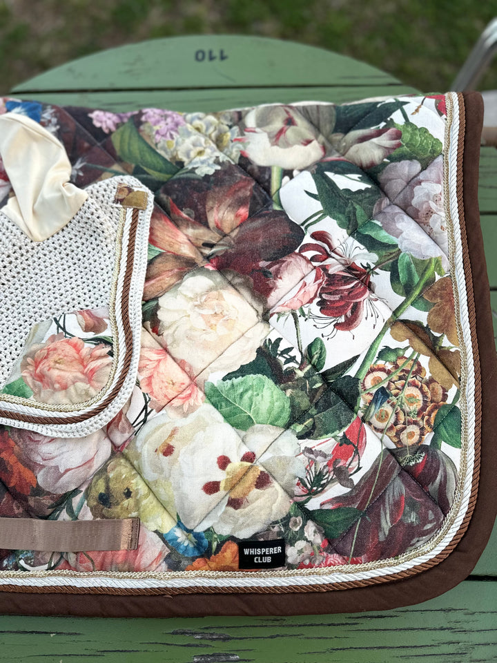 A luxurious handmade saddle pad and ear bonnet set inspired by the opulent floral still-life paintings of the Dutch Golden Age. “Jardín real” combines a rich botanical tapestry print with creamy yellow ears, golden braiding and chocolate-brown edging to create a striking, timeless look for the show ring.